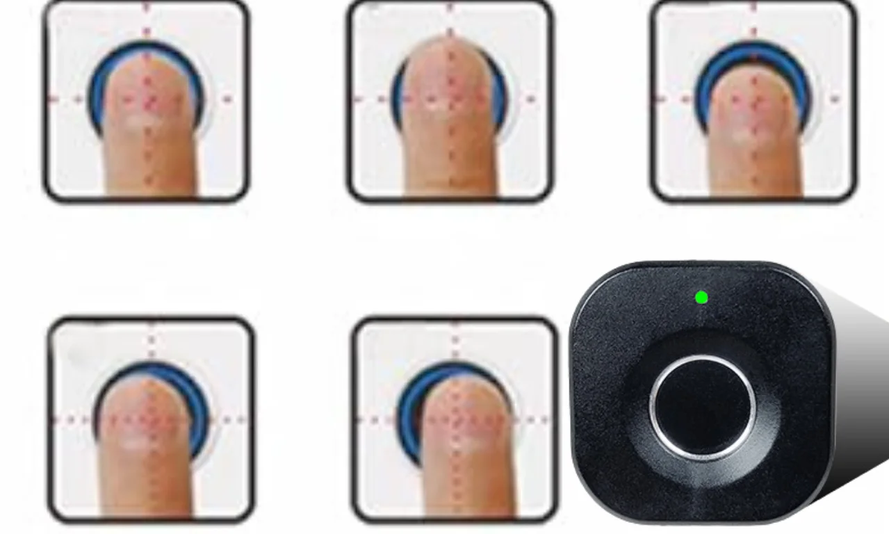 الآن أصبح في وضع التسجيل : استخدم الإصبع للتسجيل اضغط خمس مرات بزوايا مختلفة. ثم يضيء الضوء الأخضر، مما يشير إلى أن بصمة الإصبع الأولى تم تسجيلها بنجاح.